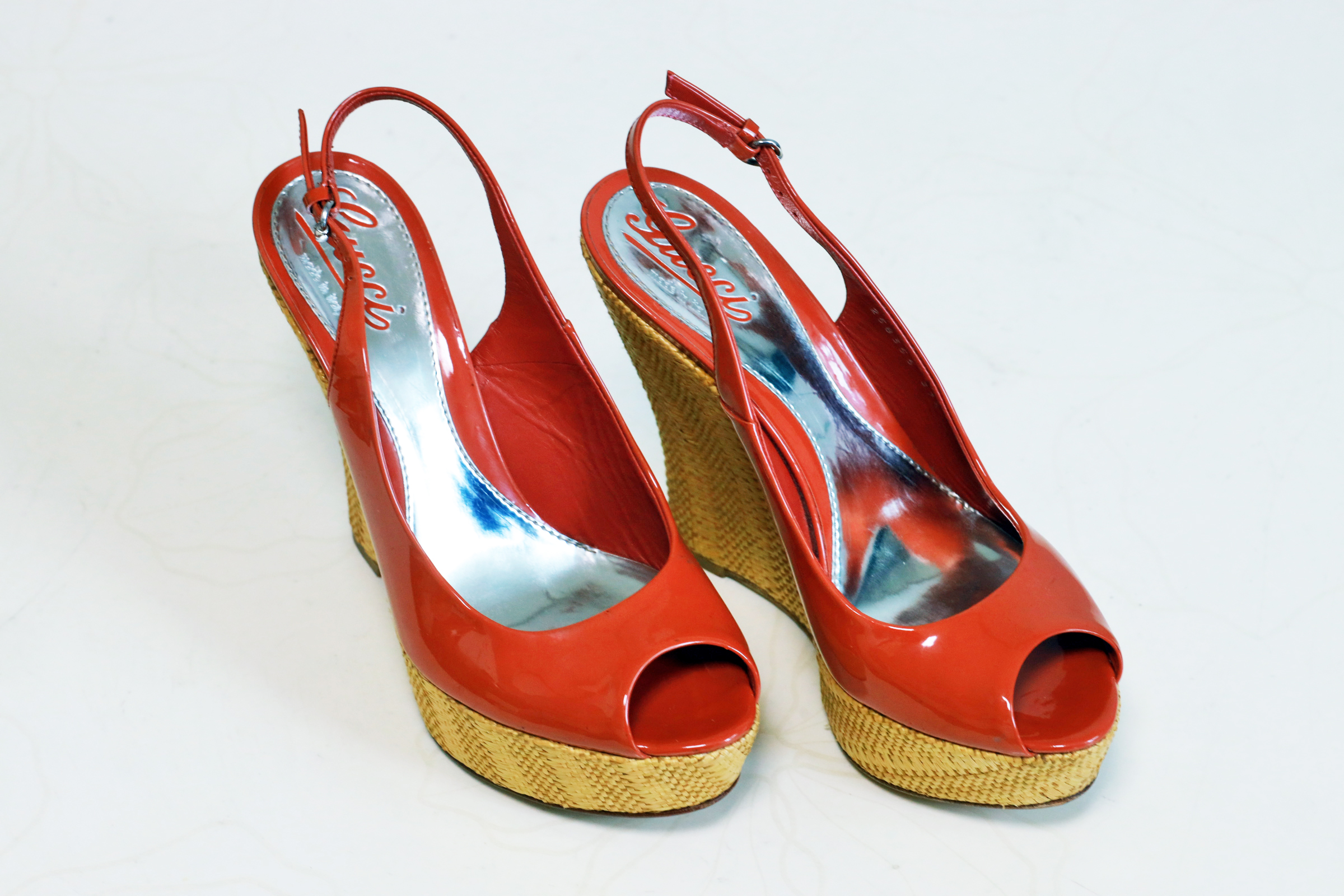 정품 GUCCI 구찌 코랄 페이던트 레더 라피아 웨지 힐 슈즈